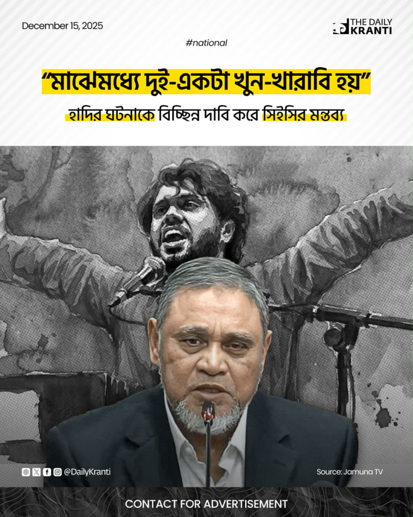 গুলিবিদ্ধ ওসমান হাদির ঘটনাকে বিচ্ছিন্ন বলে মন্তব্য করেছেন প্রধান নির্বাচন কমিশনার এ এম এম নাসিরউদ্দিন। সোমবার রাজধানীর গুলশানে ইয়ুথ ভোটার কর্মসূচি উদ্বোধনের পর তিনি এ কথা বলেন। সিইসি বলেন, বাংলাদেশে মাঝেমধ্যে এ ধরনের খুন-খারাবির ঘটনা ঘটে, এতে আইন-শৃঙ্খলার অবনতি বোঝায় না। তিনি প্রশ্ন রাখেন, আইন-শৃঙ্খলার অবনতি কোথায় হয়েছে। উদাহরণ হিসেবে তিনি আওয়ামী লীগ নেতা আহসানউল্লাহ মাস্টার ও সাবেক অর্থমন্ত্রী শাহ এ এম এস কিবরিয়ার হত্যার প্রসঙ্গ টানেন। সিইসি জানান, নির্বাচন ঘিরে সব শঙ্কা দূর করে ভোটগ্রহণ সম্পন্ন করা হবে। ভোটের সময় আইন-শৃঙ্খলা স্বাভাবিক রাখতে বাহিনীকে নির্দেশনা দেওয়া হয়েছে বলেও জানান তিনি।