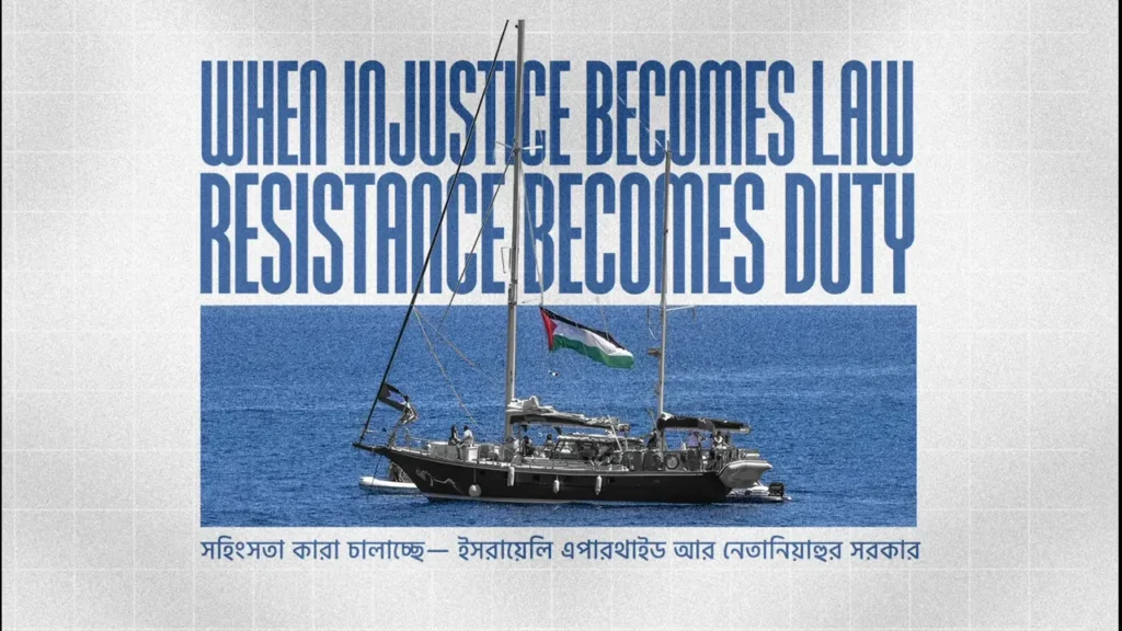 “When injustice becomes law, resistance becomes duty”, যখন অন্যায় আইন হয়ে দাঁড়ায়, তখন প্রতিরোধই হয়ে ওঠে ন্যায়। গাজাবাসীর পাশে দাঁড়াতে রাষ্ট্রগুলো যখন ব্যর্থ, আন্তর্জাতিক আদালত যখন ইসরায়েলকে যুদ্ধাপরাধী হিসেবে নিরপেক্ষভাবে বিচার করতে অক্ষম, তখন মানুষের প্রতি মানুষের মমত্ববোধই হয়ে উঠছে সবচেয়ে বড় শক্তি। সেই শক্তিই আজ গাজাবাসীর পাশে দাঁড়াতে সাহস যোগাচ্ছে হাজার হাজার মানুষকে, ২০২৫ সালের সমুদ্রে ভাসমান ফ্লোটিলা তার সবচেয়ে বড় উদাহরণ।